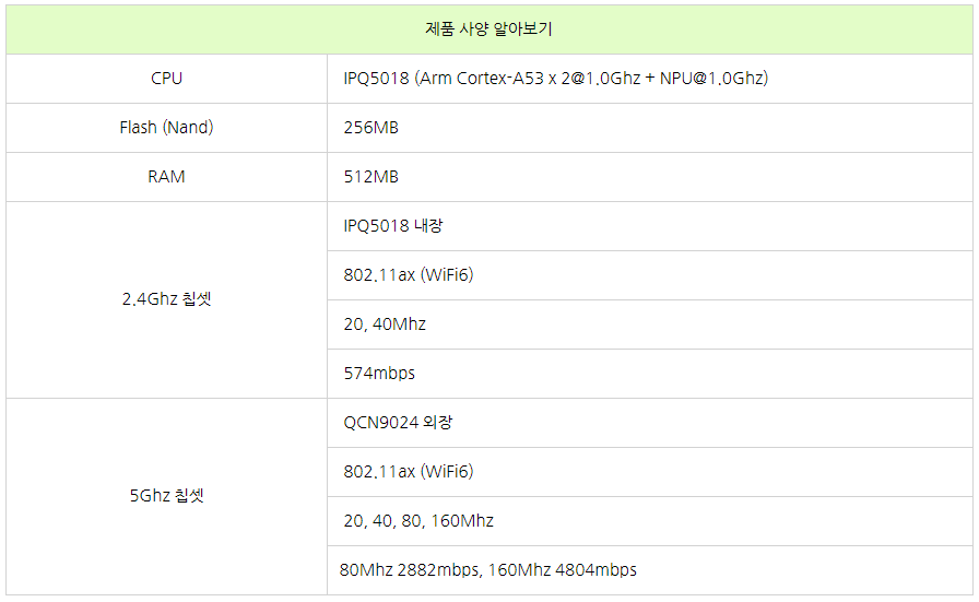 그럼에도 불구하고, 제가 이 제품을 추천드리는 이유가 있습니다. 바로 5Ghz를 담당하는 칩셋 QCN9024 때문입니다. 사실 공유기를 볼때 가장 중요한 것은 CPU가 아니라 무선칩셋이 어떤 제품이 사용되어 있는가 입니다. 앞서 설명드린 BCM6755를 탑재하고 나온 제품들은 2.4Ghz와 5Ghz를 가리지 않고 BCM6755 내장 기능을 통해 작동합니다.