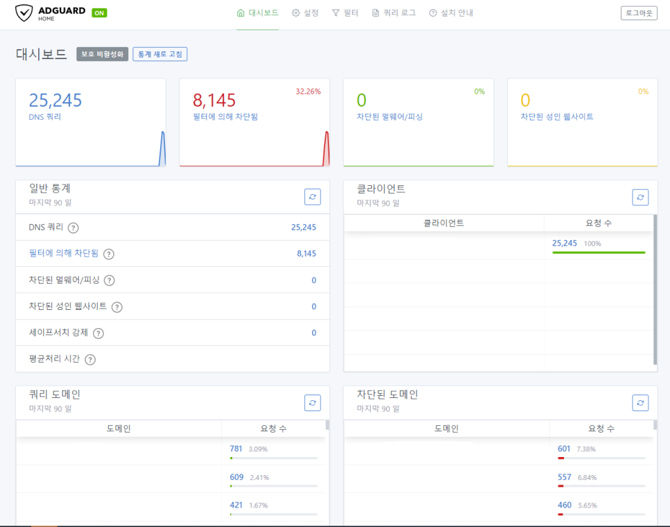 adguard home 성능도 만족스럽습니다. 광고 차단도 잘 되고 내부 처리 속도도 준수하게 나옵니다. adguard dns 서버가 일본에 있어서 핑이 좀 나왔는데 로컬로 처리하니 레이턴시 차이가 좀 나는군요. 사실 체감은 전혀 되지 않는게 문제입니다. (국내에 서버가 있는 nextdns 사용할때도 체감이 되지 않았습니다.)